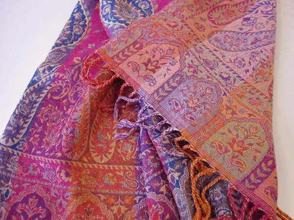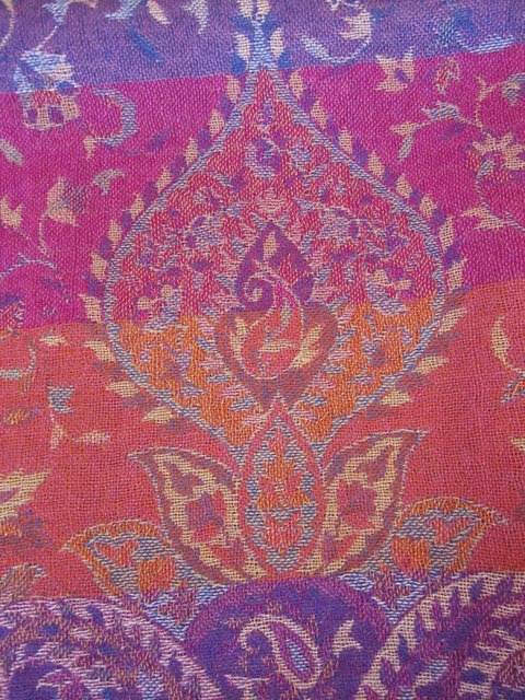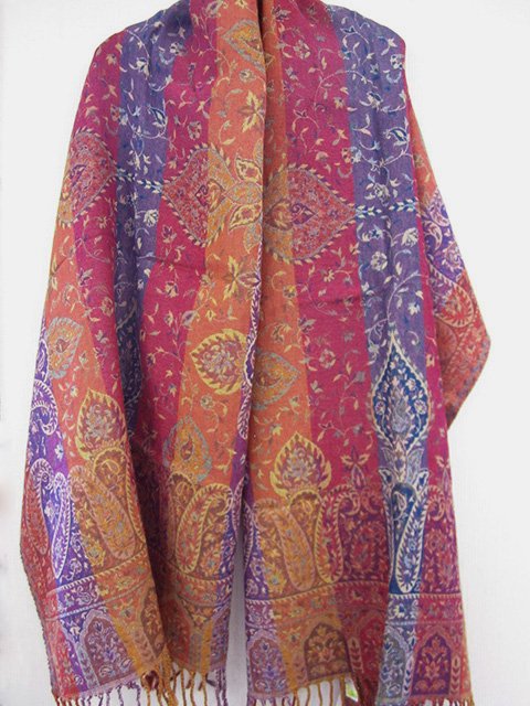 エキゾチックなペイズリー柄を華やかな赤、ピンク系で仕上げた幅広でゴージャスで温いショールです。