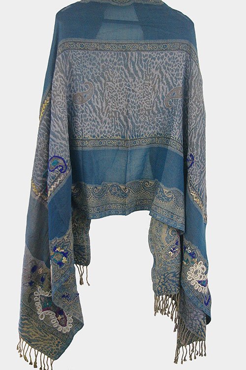 エキゾチックなペイズリー柄をブルー系で仕上げた幅広でゴージャスで温いショールです。