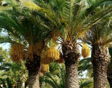 鈴なりになっている黄色の実がデーツです。